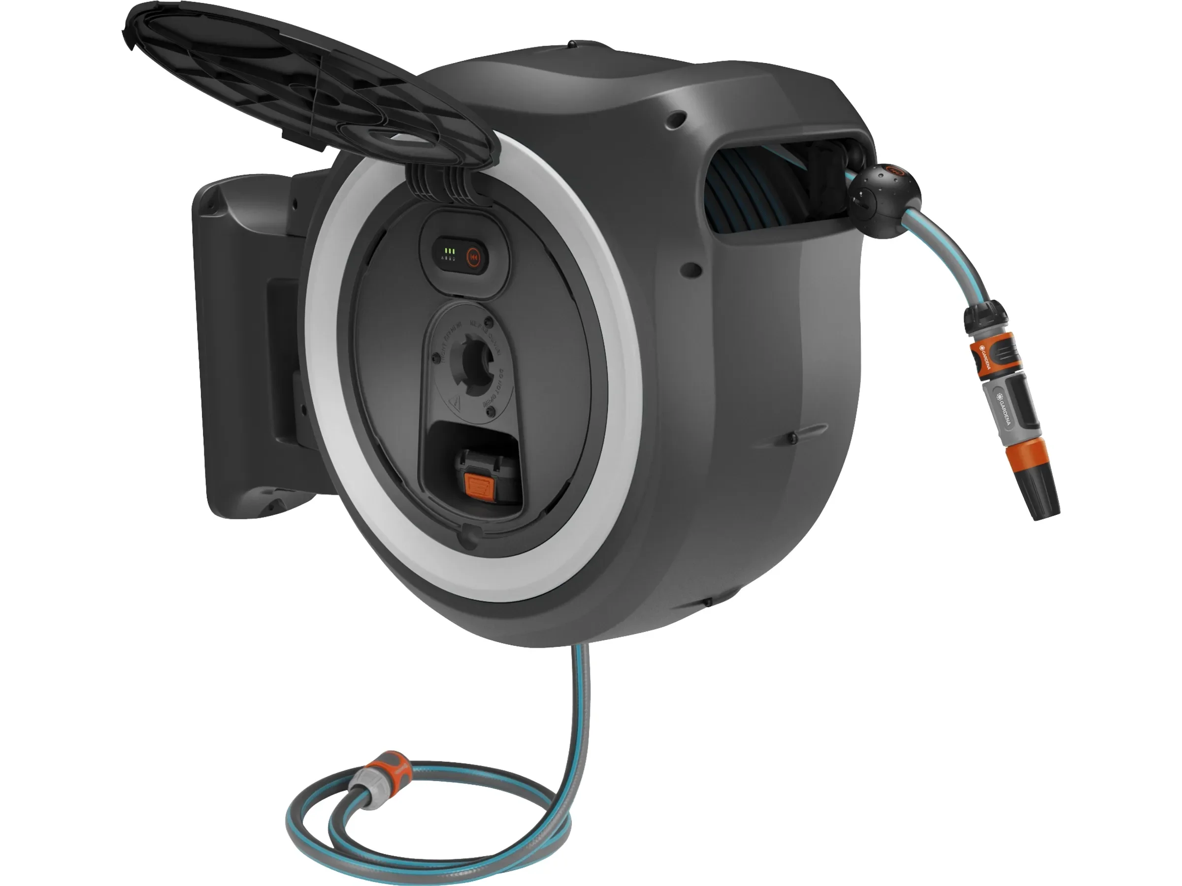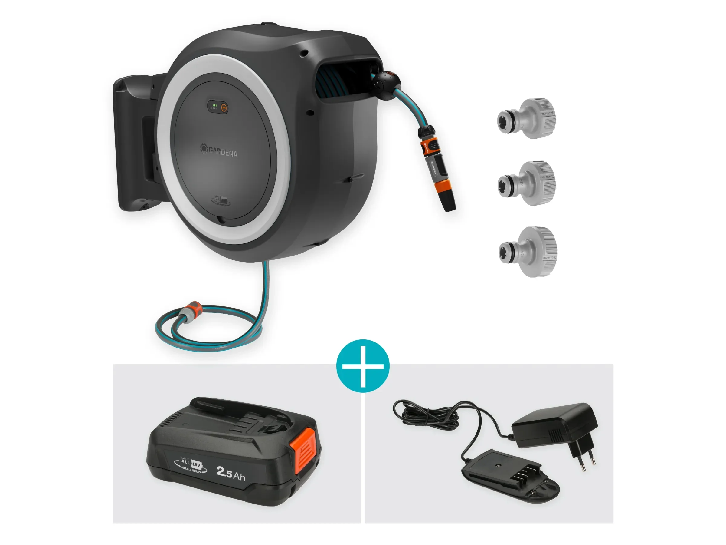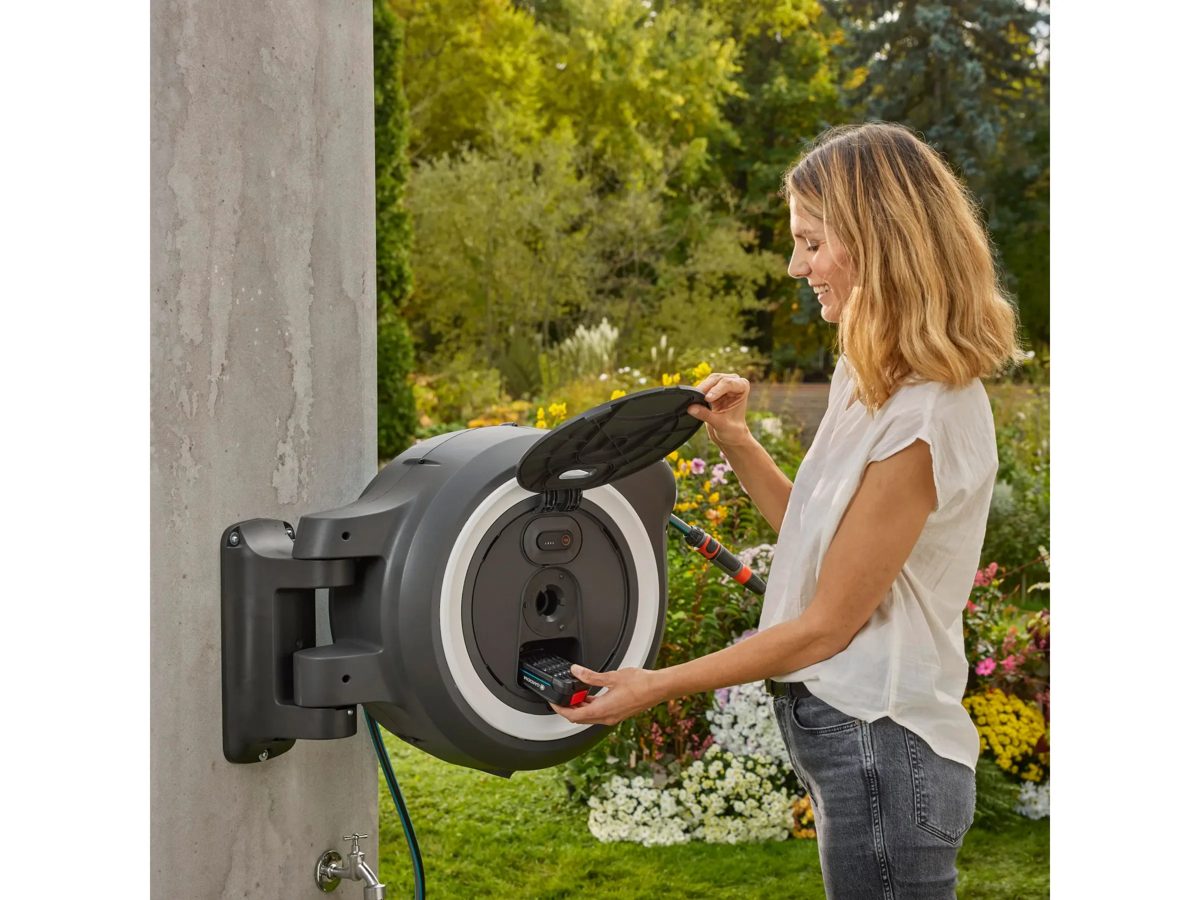 Die RollControl+-Technologie mit integrierter Schlauchführung sorgt für ein sanftes, verwicklungsfreies Einrollen und reduziert auf den letzten Metern die Geschwindigkeit zum Schutz von Möbeln und Gegenständen. Die Box ist frost- und UV-beständig und kann ganzjährig an der Wand verbleiben. Akku und Ladegerät gehören zum Power For All-System und sind markenübergreifend kompatibel.