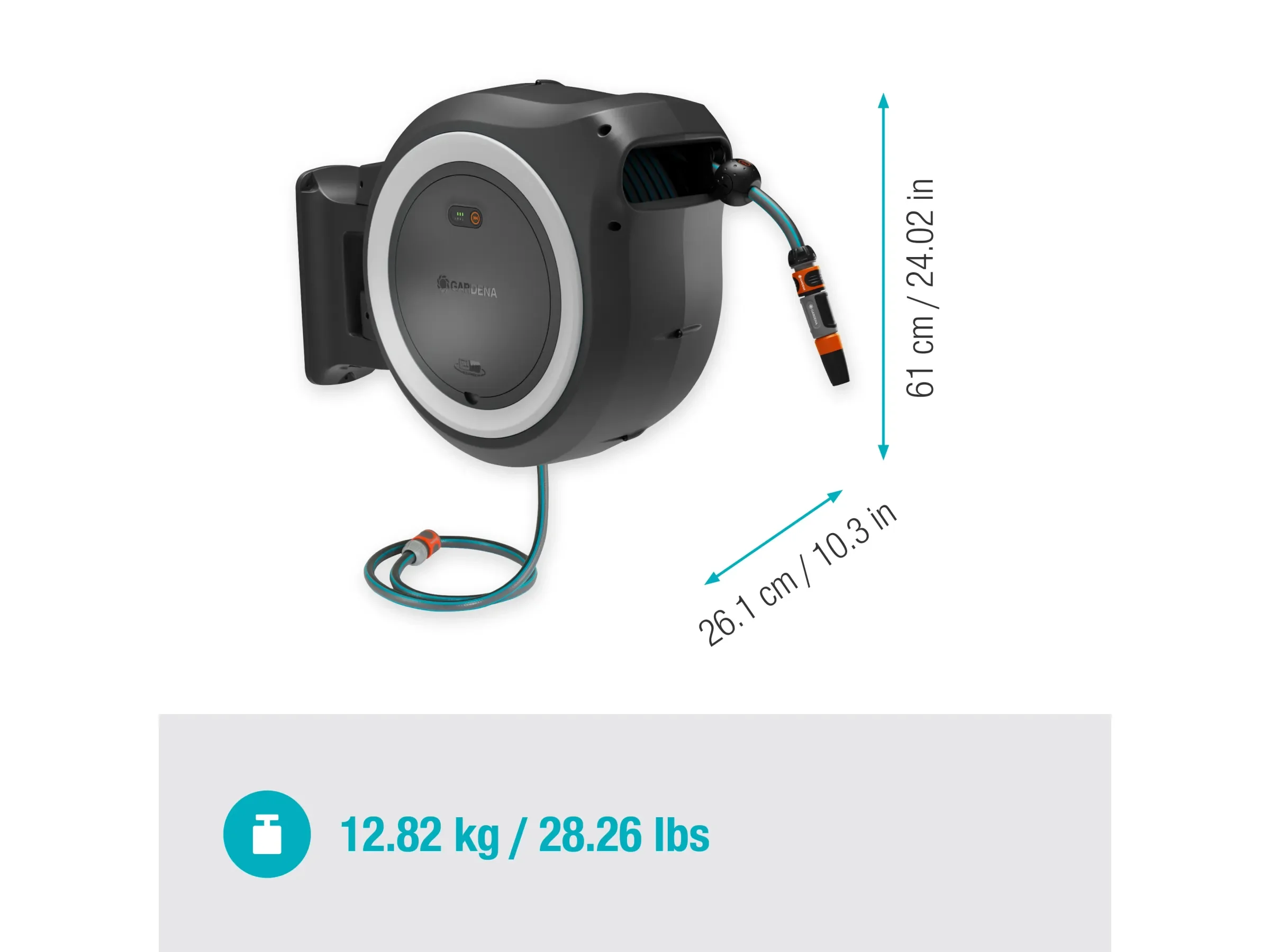 | Aufwicklung | Automatisch per Knopf (Schlauchende / Gehäuse) |