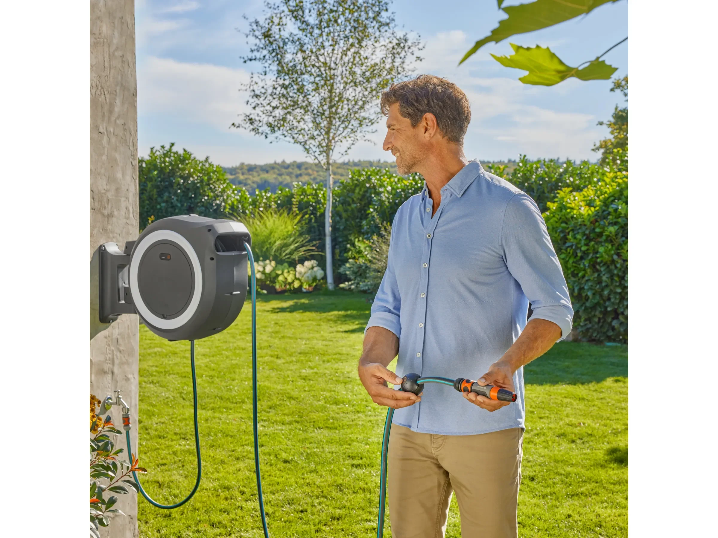 Die Akku-Wand-Schlauchbox PowerRoll XXL ermöglicht eine komfortable Bewässerung großer Gärten. Der 40 m lange Schlauch lässt sich mühelos ausziehen und per Knopfdruck automatisch einrollen – wahlweise am Schlauchende oder direkt am Gehäuse. Die 180° schwenkbare Wandhalterung verhindert Knicken und erleichtert die Führung um Beete und Hindernisse.