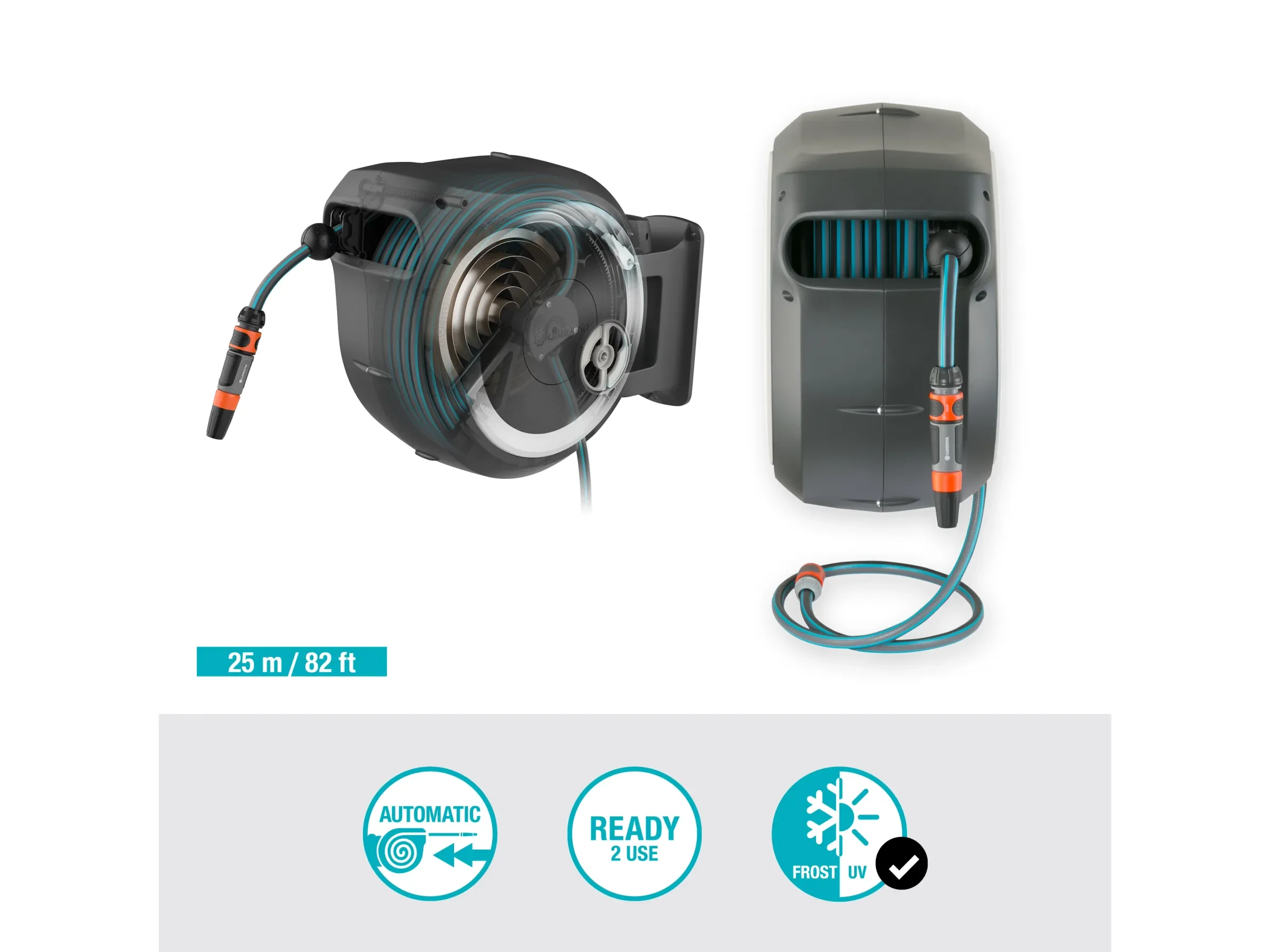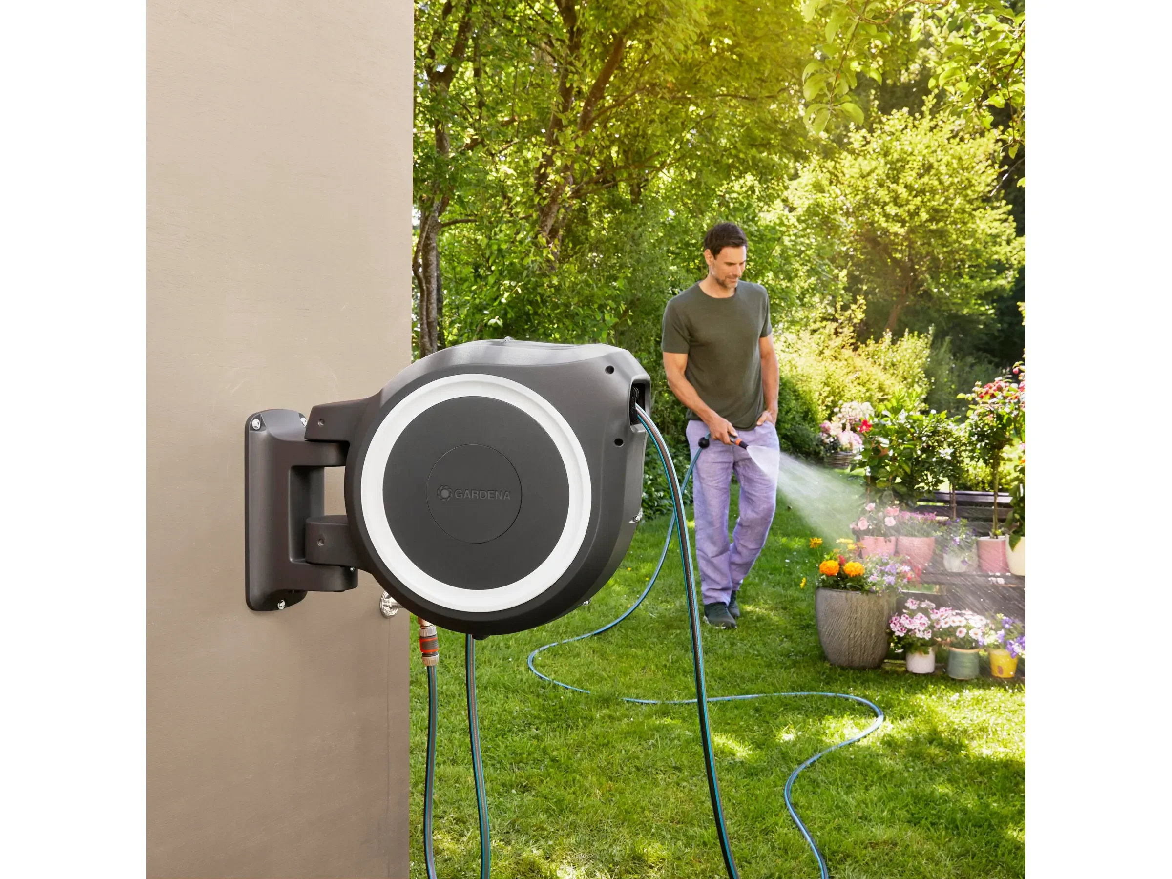 Highlights: Automatisches Aufrollen mit RollControl, Arretierstopps für flexibles Ausziehen, schwenkbare Wandhalterung, knickfreie Führung, wetterfest für den Ganzjahreseinsatz, kompakte und ordentliche Schlauchaufbewahrung.