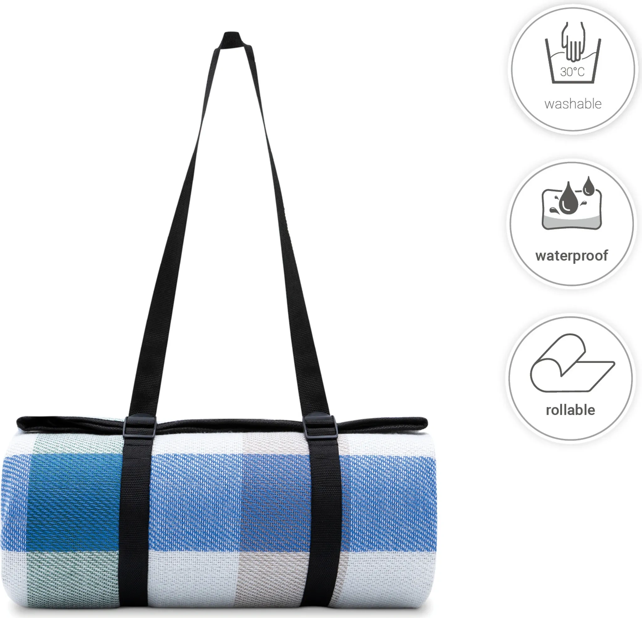 Die Unterseite aus Poly-Ethylen-Vinylacetat (PEVA) schützt zuverlässig vor Feuchtigkeit, während die Oberseite aus robustem Polyester angenehm weich, pflegeleicht und farbbeständig ist. Mit praktischem Tragegriff und einfachem Faltmechanismus lässt sich die Decke platzsparend transportieren – ideal für unterwegs.